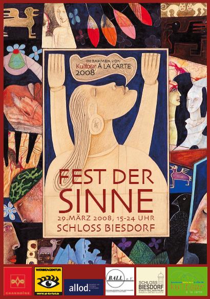 Aus dem Veranstaltungsprogramm: 15.00 Uhr Eröffnung mit Arvid Kleinschmidt am Klavier und der Vernissage des Malers Giovanni Orlando ab 15.30 Uhr - Kulinarisches Nachmittagsbüfett mit Kaffee- und Teespezialitäten, canadian cheesecake und vielen weiteren Köstlichkeiten ab 15.30 Uhr - Streicheleinheiten für Körper und Seele - Channoine-Studios, Lifestyle mit Vera Schlimper, Yoga mit Frauen Fitness Balance, Thai-Massagen mit Claudia Basalla ab 15.30 Uhr - Kinderprogramm mit "Liederhaus" ab 3 Jahre: "Paul hat einen Mückenstich" ab 15.30 Uhr - Literarischer Frauenstammtisch: " Mit allen Sinnen" ab 15.30 Uhr - Malen live mit Ute Vehse Zins; anschließende Versteigerung ab 16.00 Uhr - Werben ist Kunst mit Peter Funk ab 16.15 Uhr - Weinverkostung mit wein et cetera ab 16.30 Uhr - a capella: Konzertchor Berliner Pädagogen ab 17.00 Uhr - Erzählsalon mit Dagmar Steinborn zum Thema Gerüche ab 17.00 Uhr - Yoga mit Kathrin Henschel ab 17.30 Uhr - Solo-Piano mit Arvid Kleinschmidt ab 17.30 Uhr - Erotik und Spannung in Chansons mit "Scorbüt" ab 18.00 Uhr - Massagen von Kopf bis Fuß mit Annegret Karsch ab 18.00 Uhr - Eröffnung des kulinarischen Schloss-Bufetts am Abend qb 18.00 Uhr - Klangwelten (kleine Einführung in die Natur-Tontechnik) mit Jochen Korm ab 18.15 Uhr - Erotik und Spannung in Chansons mit "Scorbüt" ab 18.15 Uhr - kleiner Entspannungskurs mit Kathrin Henschel ab 18.30 Uhr - Chansons d´amour mit Eva Schöngut ab 18.30 Uhr - Bollywood-Tanz mit Canan ab 18.45 Uhr - "Der 80. Geburtstag" - gelesene Komik mit Ronald Ehlers ab 19.00 Uhr - Farbensinfonie (Anregendes zum Thema von Johanna Hempel/Channoine) ab 19.30 Uhr - Bauchtanz mit Sükran Karayilan ab 19.30 Uhr - Liebesgedichte aus zwei Jahrhunderten mit Blanche Kommerell ab 20.00 Uhr - World music mit der Gruppe Oruc Gürbüz ab 21.00 Uhr - vom "Irrtum der Welt" singen Welfare Dandys ab 21.30 Uhr - Magische Kräuter und Aphrodisiaka: sinnliche Cocktails mit Sebastian Herzberg von der Sporthalle an der Wuhle ab 22.30 Uhr - Erotische Modenschau des Modemuseums Schloss Meyenburg und der Boutique Peccato, Choreographie: Josefine Edle von Krepl ab 23.30 Uhr - Festlicher Ausklang mit Tango Argentino und Ute Vehse Zins & Peter Manoli |